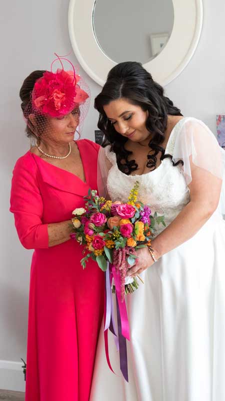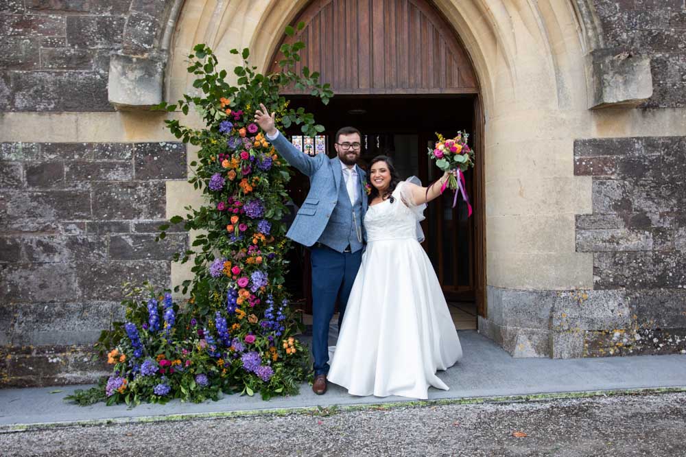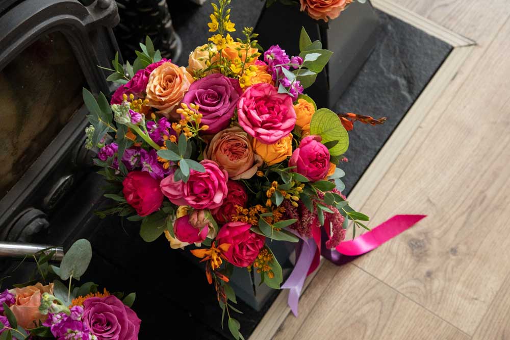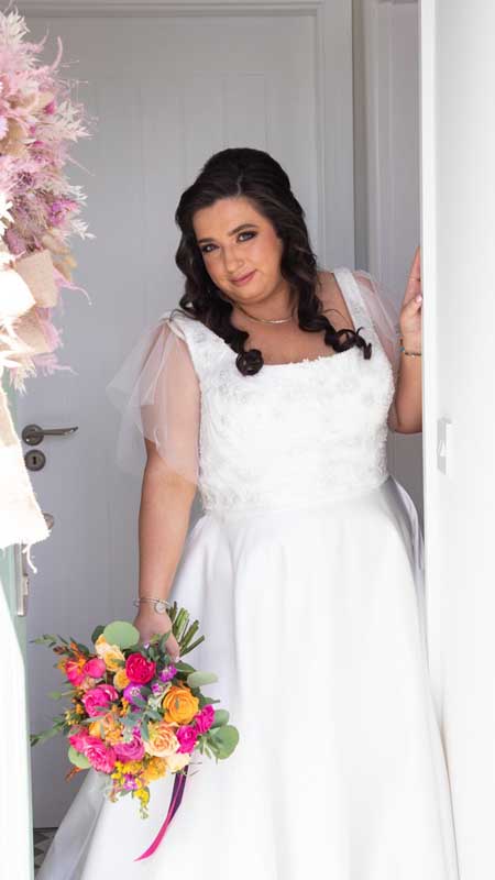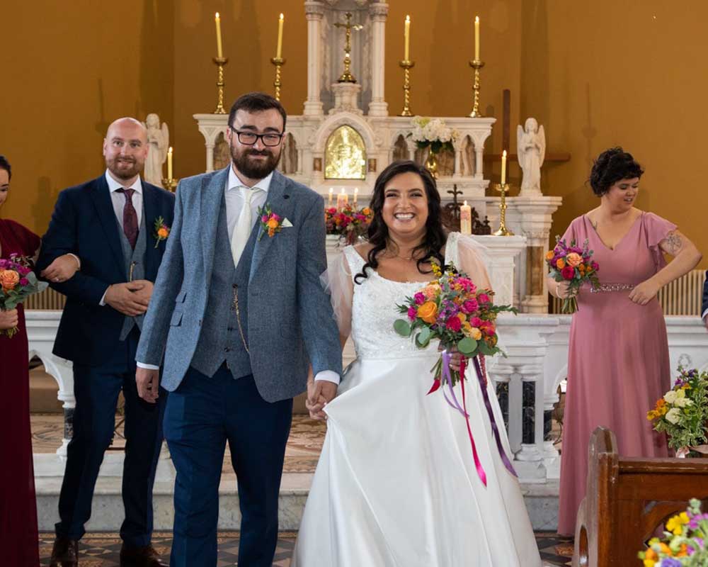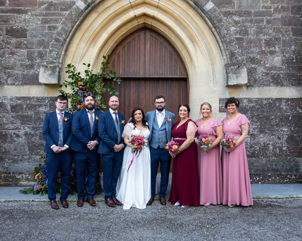 For Sarah and Daithe, Nicola created a collection of bespoke wedding flowers that reflected their personal style and story. The bridal bouquet was designed with abundant, layered textures, complemented by elegant bridesmaids’ arrangements. Ceremony florals brought a sense of intimacy and beauty to the church setting, while the reception flowers at Kinsale Hotel and Spa transformed the space with contemporary, artful designs that left a lasting impression.